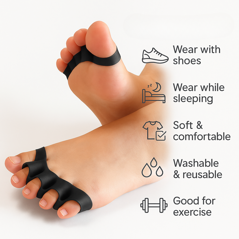 If your toes are squished, crooked, or feel out of place, you're not alone. These issues can make your feet hurt — and make you feel embarrassed. Our product gently moves your toes back where they belong, helping your feet feel better and look better too.